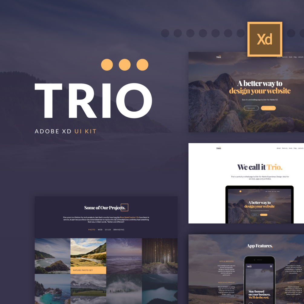 Trio is a stylish kit of UI screens for the newest UI/UX tool from Adobe. Carefully crafted and easy to use landing page builder. Must have components for those, who want to boost their workflow. Trio UI Kit for Adobe XD consists of 9 categories, 160+ screens and 700+ elements. Bootstrap grid, 3 color versions, vector shapes and Google fonts will help you to create modern landing pages for creative teams, apps and products.